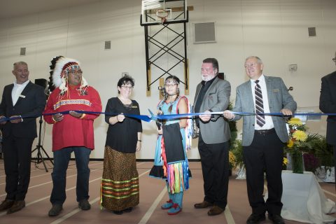 With over 300 guests in the new gymnasium, anticipation and enthusiasm filled the air as Grade 11 Honour Student Shaneek cut the ribbon. She was flanked by Deputy Minister, Alberta Education Dr. Curtis Clarke; Chief Vernon Saddleback, Samson Cree Nation; Principal Gail Wilton; Honourary Campaign Chair Larry Wilkins; President of the Alberta Conference Gary Hodder; Mark Johnson, President, SDA Church in Canada; Dan Jackson, President, SDA North American Division; Lynn McDowell, Director Planned Giving and Manager of The Bridge Campaign, Alberta Conference; Keith Richter, CFO/Treasurer, Alberta Conference; Janet Griffith, Education Superintendent, Alberta Conference; William Piersanti, Owner, Sunrise Constructors Inc.; and Wayne Williams, Executive Secretary/VP Administration, Alberta Conference.