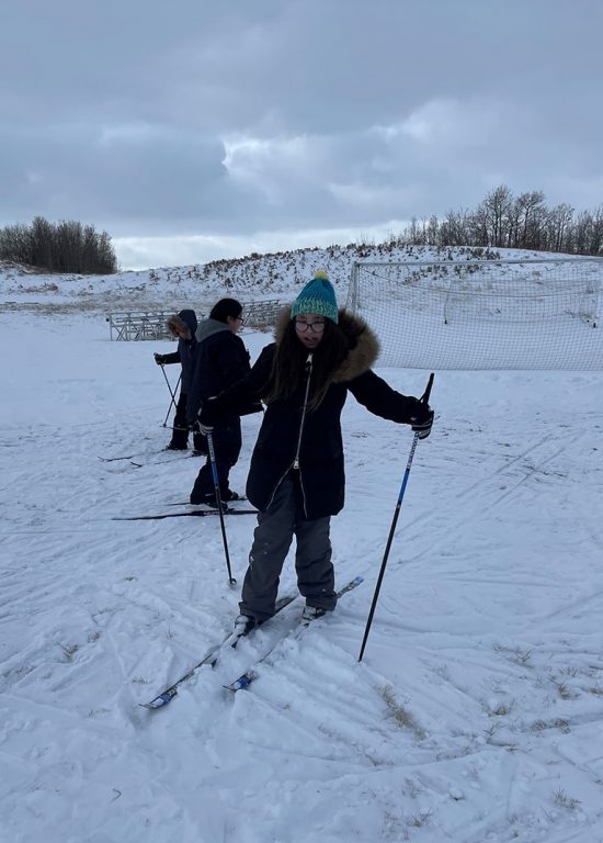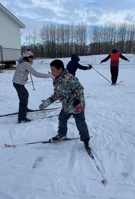 With 50 pairs of skis and boots in tow for kids Grade 4-12, Spirit North brought enthusiasm as well as equipment and expertise to MANS in the height of winter and COVID stress this past January, courtesy of the Ptarmigan Foundation. Principal Mike Willing used his skidoo to create tracks all over the 10-acre school property. Teachers as well as students were pleased to welcome Spirit North again in November (photos below), and look forward to regularly using the equipment — reinforcing, it’s hoped, a life-long love of outdoor winter athletics.