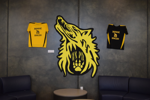 “Sports are big at Mamawi Atosketan” is the message sent by the Mamawi Howlers logo that went up in June on the gym’s main lobby-facing wall. The concept for the logo, which originated with the volleyball team, was approved by the junior-senior high student body and executed by high school teacher David Barritt. The imposing wall logo set the tone for the two-day intensive volleyball workshop attended by the Howlers (overnight stay in the regulation tournament-size gym included) on Oct. 25 and 26.